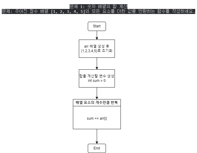 문제 1: 숫자 배열의 합 계산 문제: 주어진 정수 배열 [1, 2, 3, 4, 5]의 모든 요소를 더한 값을 반환하는 함수를 작성하세요.